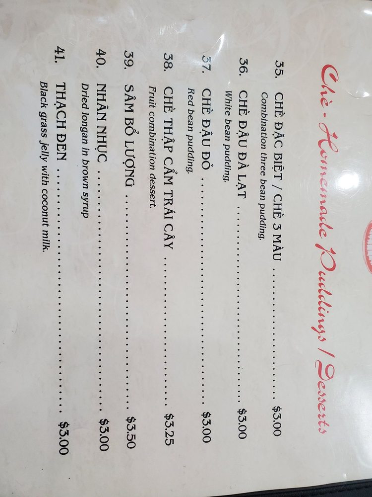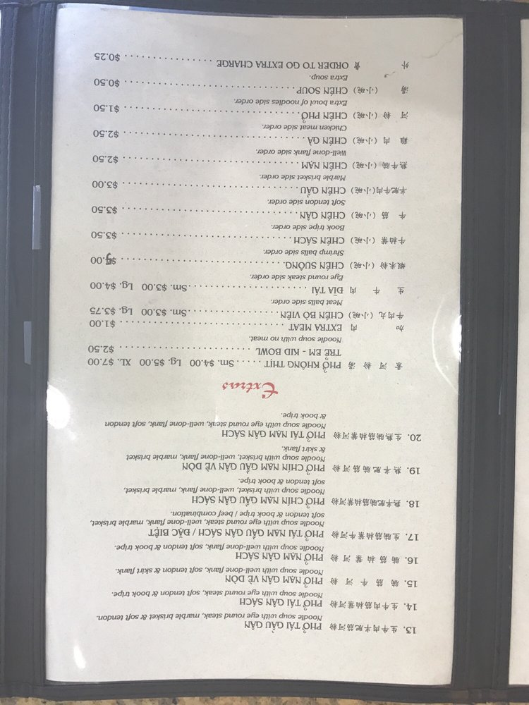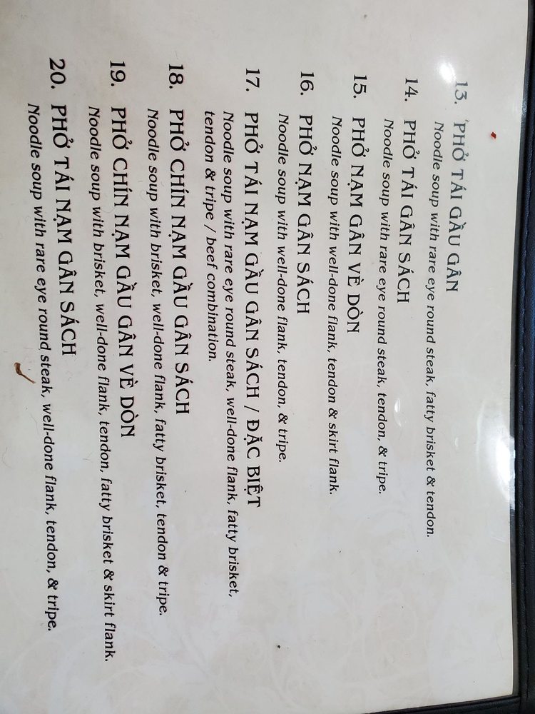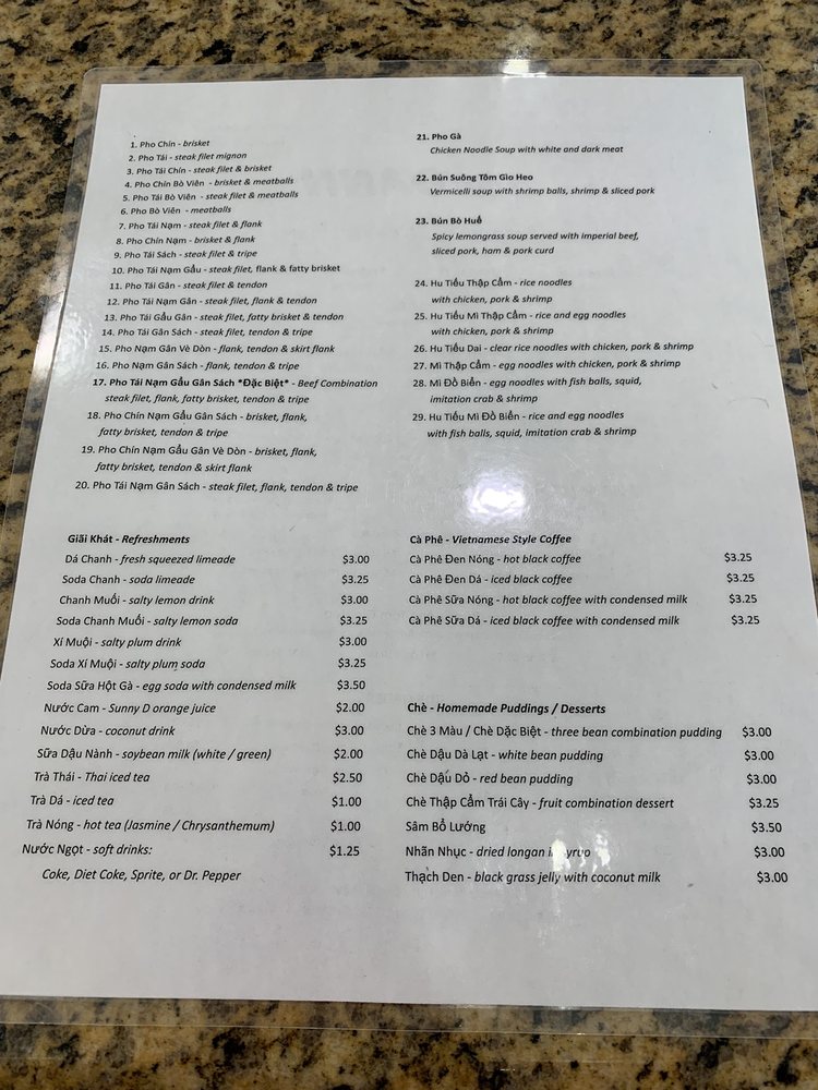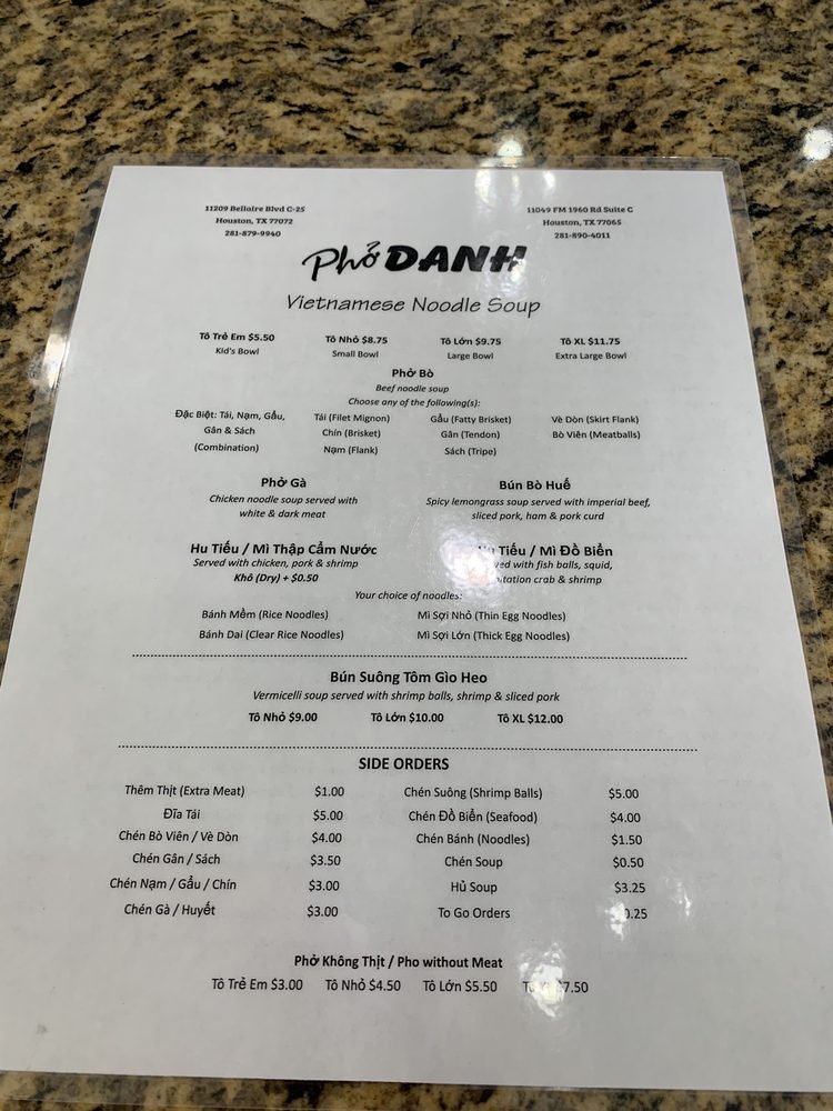 Introducing the menu at Pho Danh, a Vietnamese soup restaurant located in Houston, TX, that offers a variety of options for both meat-lovers and vegans. From the popular Pho Tai Bowl with rare eye round steak to the flavorful Chen Suong Shrimp balls, the menu is rich in taste and quality. The refreshing CA Phe Den Nong coffee adds a perfect ending to your meal. Customers rave about the generous portions of meat, the flavorful and tender broth, and the fast and friendly service. With ample seating for large groups and a clean, inviting ambiance, Pho Danh is a top choice for authentic pho lovers. Whether you're a fan of beef or prefer chicken soup, Pho Danh delivers on taste, quality, and satisfying portions. Visit Pho Danh for a delicious and comforting dining experience that will leave you coming back for more.